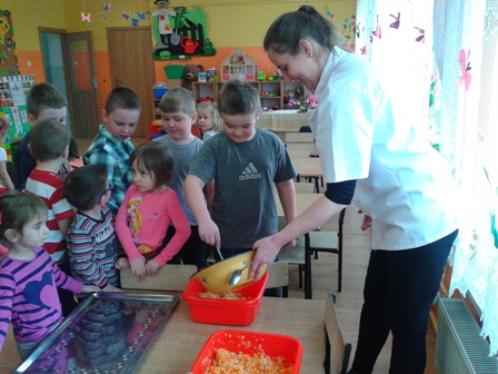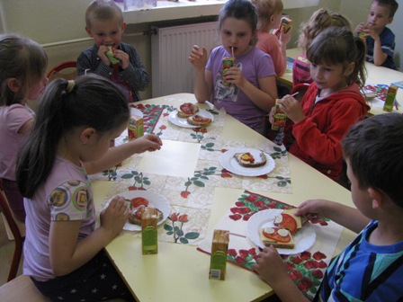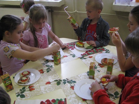 Zdrowe kanapki . Przeprowadzono konkurs na rozpoznawanie różnych dodatków do pieczywa (kminek, słonecznik, pestki dyni, sezam, orzechy, suszone śliwki itp.). Dzieci własnoręcznie przygotowały kanapki z pieczywa razowego i przyniesionych zdrowych dodatków. Następnie z apetytem zjadły.