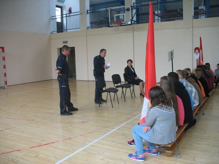 aspirant sztabowy Jacek Łapot. Uczniowie klas VIII Szkoły Podstawowej i III